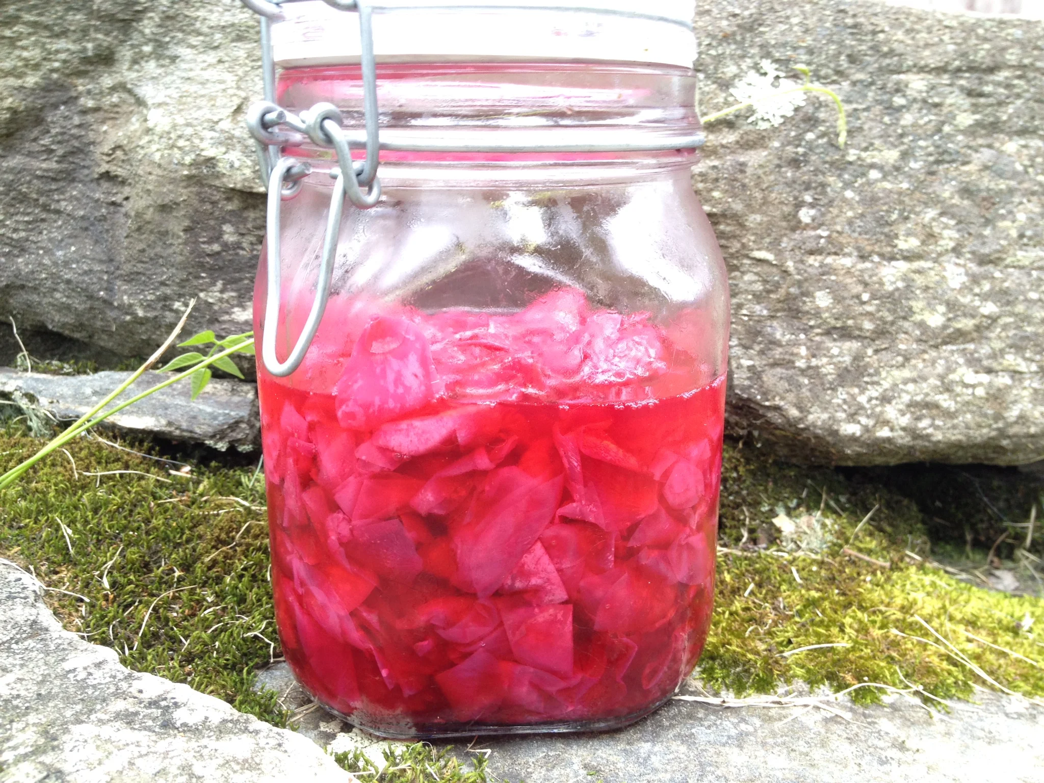 Rugosa-rose petal maple oxymel...made with vinegar, maple, and salt. Petals infuse for a week, then the liquid is strained, and the resulting syrup used in mocktails or cocktails. We have created a rhubarb-rose margharita that surpasses any we have tried: ruhbarb salt, rhubarb water kefir, rhubarb syrup, rose oxymel, and a lacto-fermented rhubarb spear.